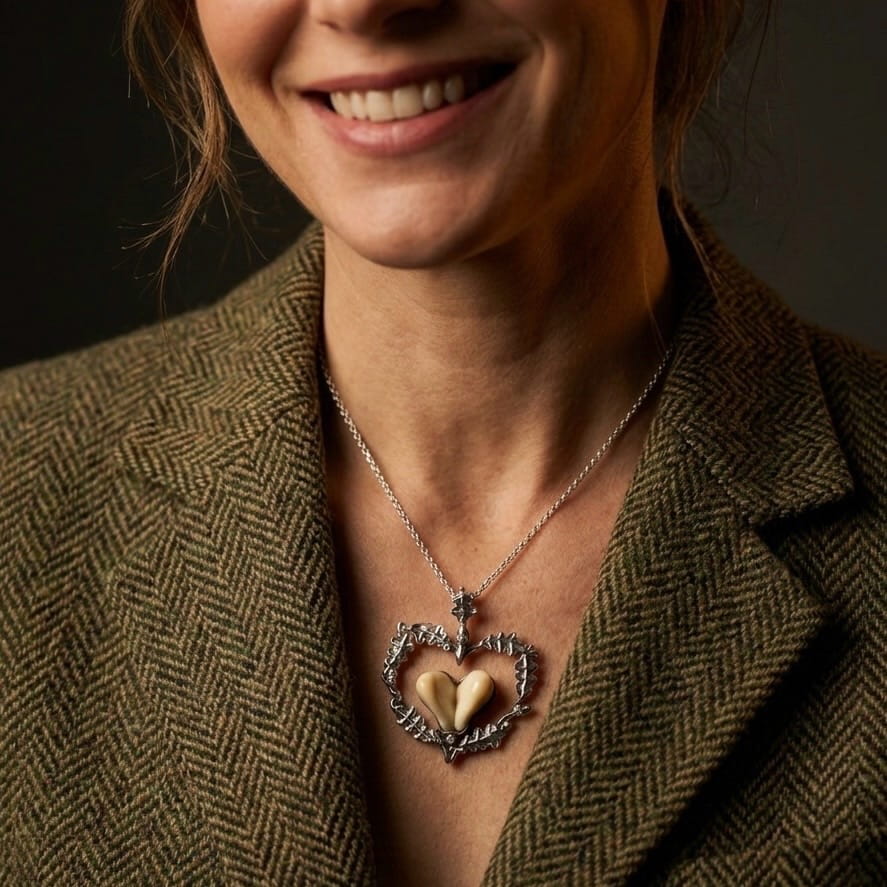 The Woodland hunting necklace with deer teeth combines authentic hunting heritage with elegant sterling silver craftsmanship. The pendant features two stag teeth, framed in a heart-shaped composition made from finely sculpted oak leaves.