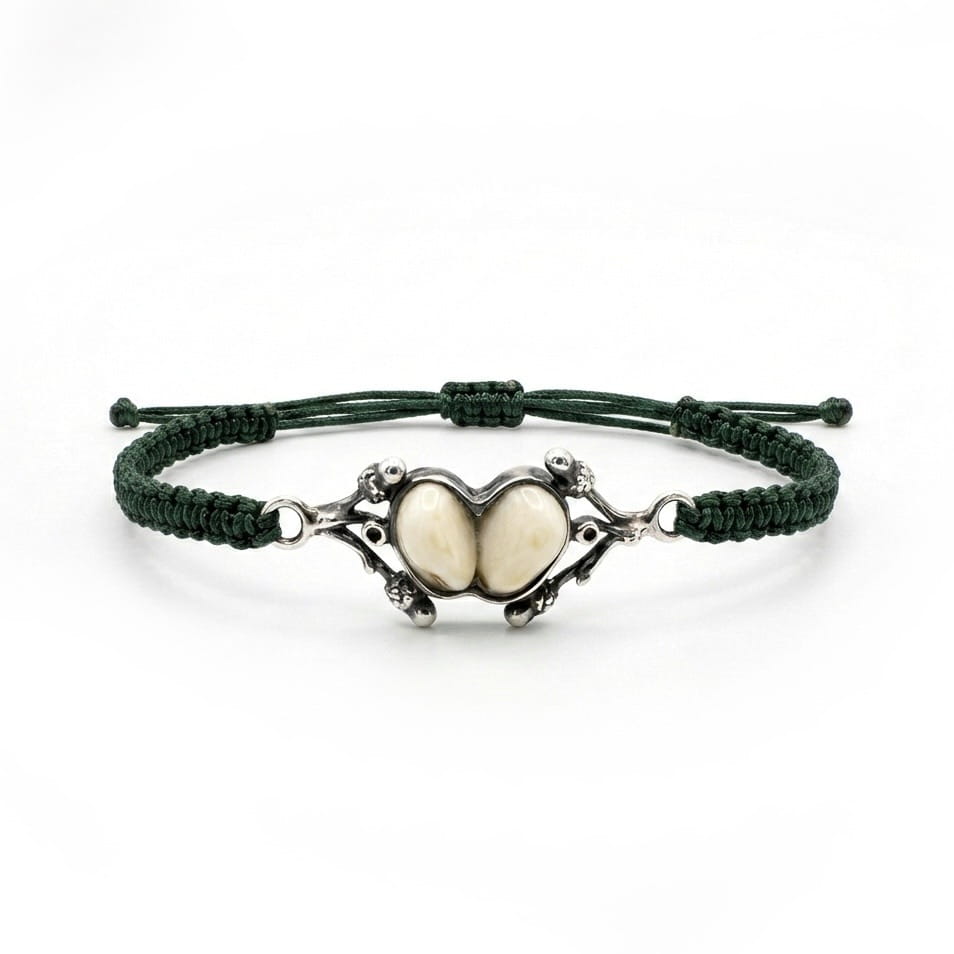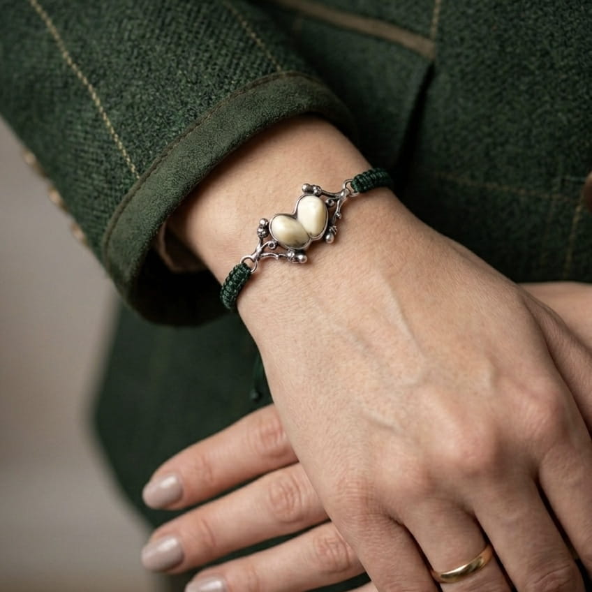 Bransoletka myśliwska „Echa Lasu” z naturalnymi grandlami łani to wyjątkowa biżuteria inspirowana naturą i tradycją łowiecką. Wykonana ręcznie ze srebra próby 925, autentycznych grandli łani oraz zielonej, plecionej linki, łączy naturalne trofeum z jubilerskim rzemiosłem.