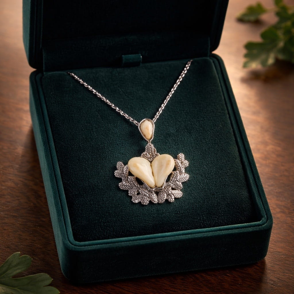 Naszyjnik Forest Treasure z grandlami jelenia to wyjątkowa kompozycja naturalnych trofeów i srebra próby 925. W centralnej części wisiorka znajdują się dwa grandle jelenia byka oraz jeden grandel łani, które zostały oprawione w dekoracyjne srebrne gałązki świerka.