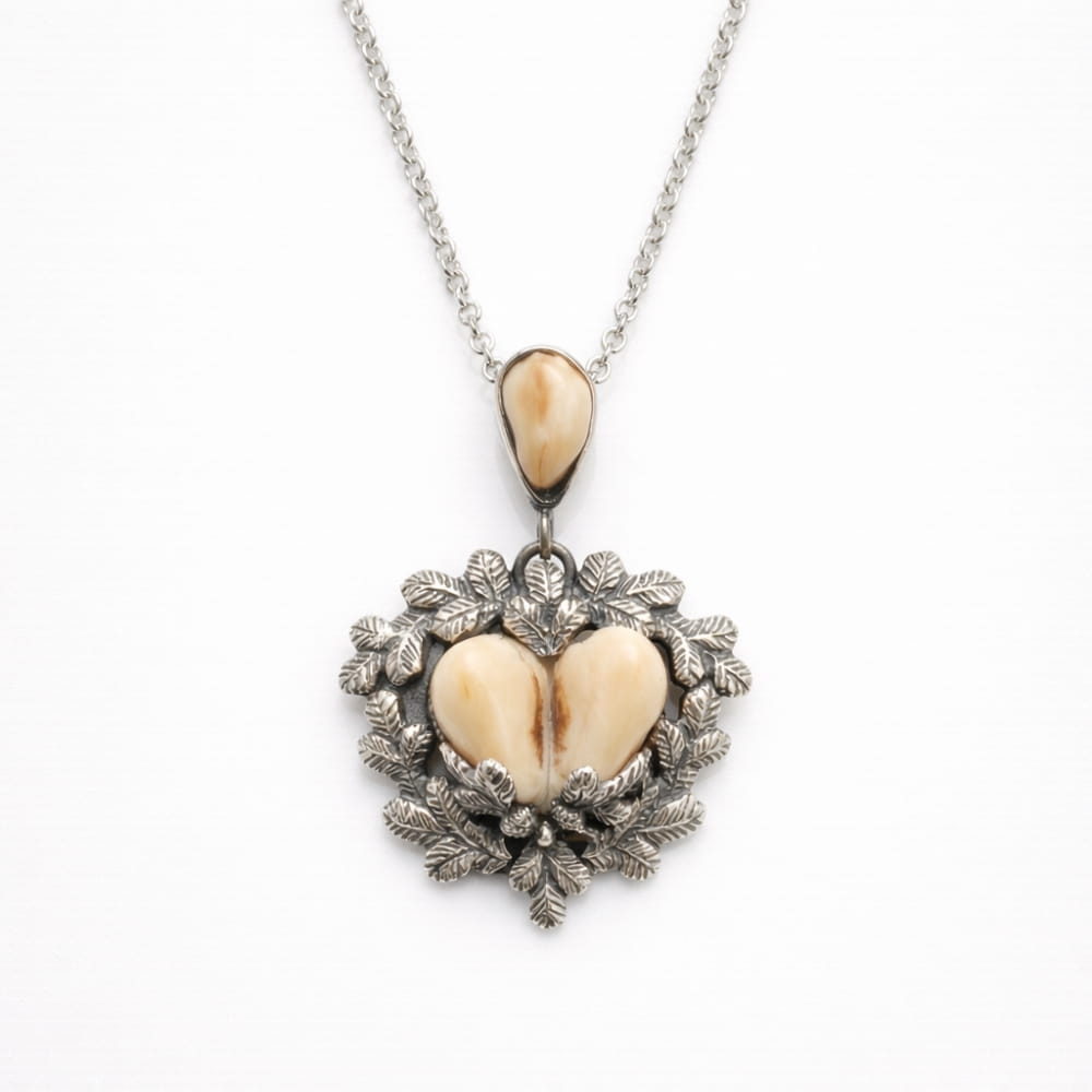 Srebrna oprawa wykonana ze srebra 925 z ornamentami świerkowych gałązek nawiązuje bezpośrednio do leśnego krajobrazu i dziedzictwa łowieckiego. Motyw świerka podkreśla autentyczność formy i sprawia, że naszyjnik wpisuje się w kategorię biżuterii myśliwskiej handmade oraz rzemiosła inspirowanego naturą.