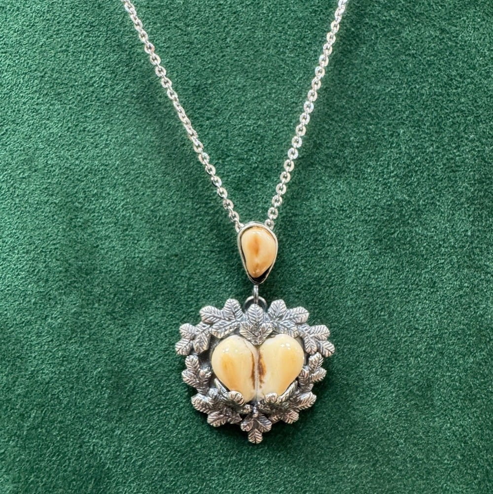 Naszyjnik myśliwski z pary grandli byka i jednego grandla łani, ozdobiony srebrnymi ornamentami gałązek świerka. Symbol natury, tradycji i łowieckiego dziedzictwa.
