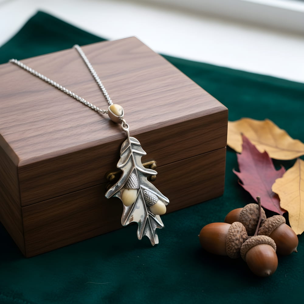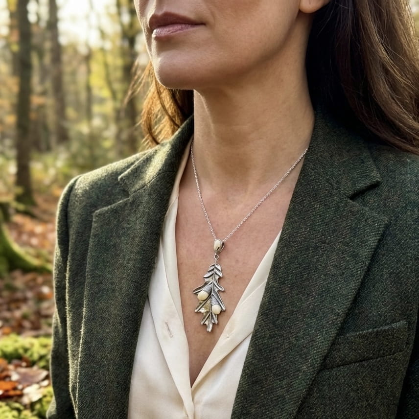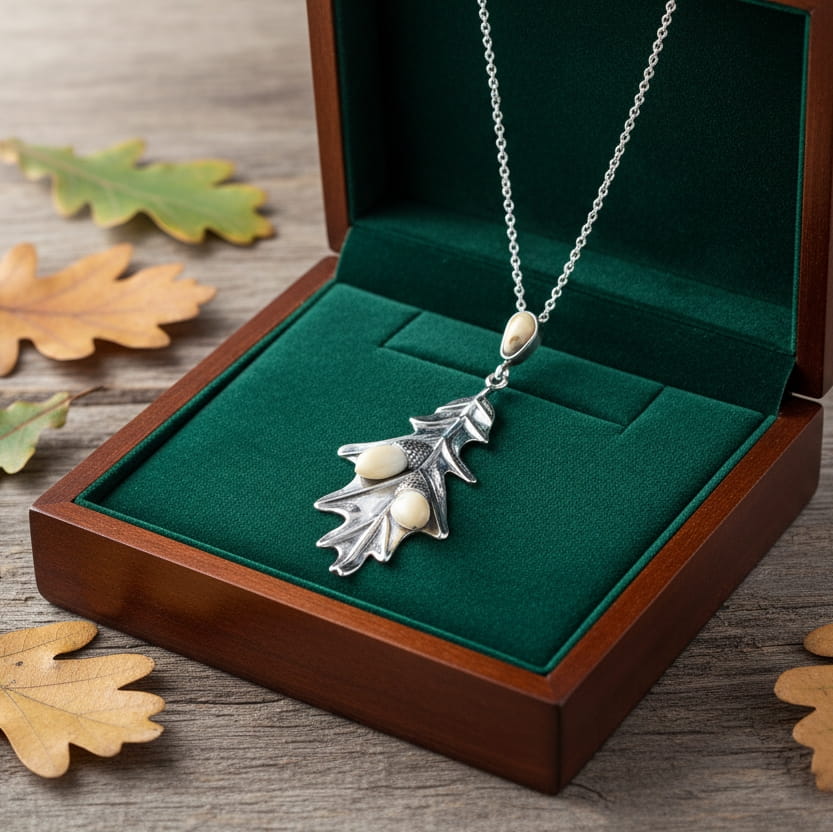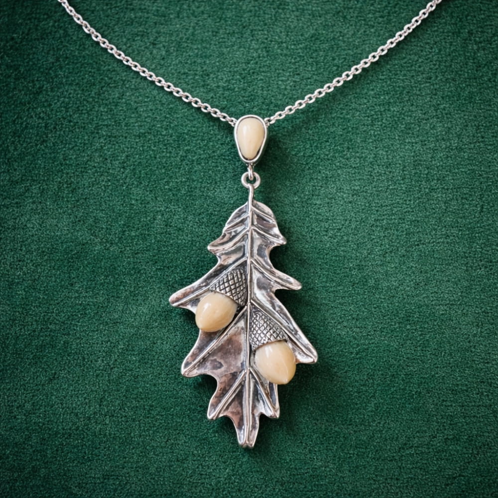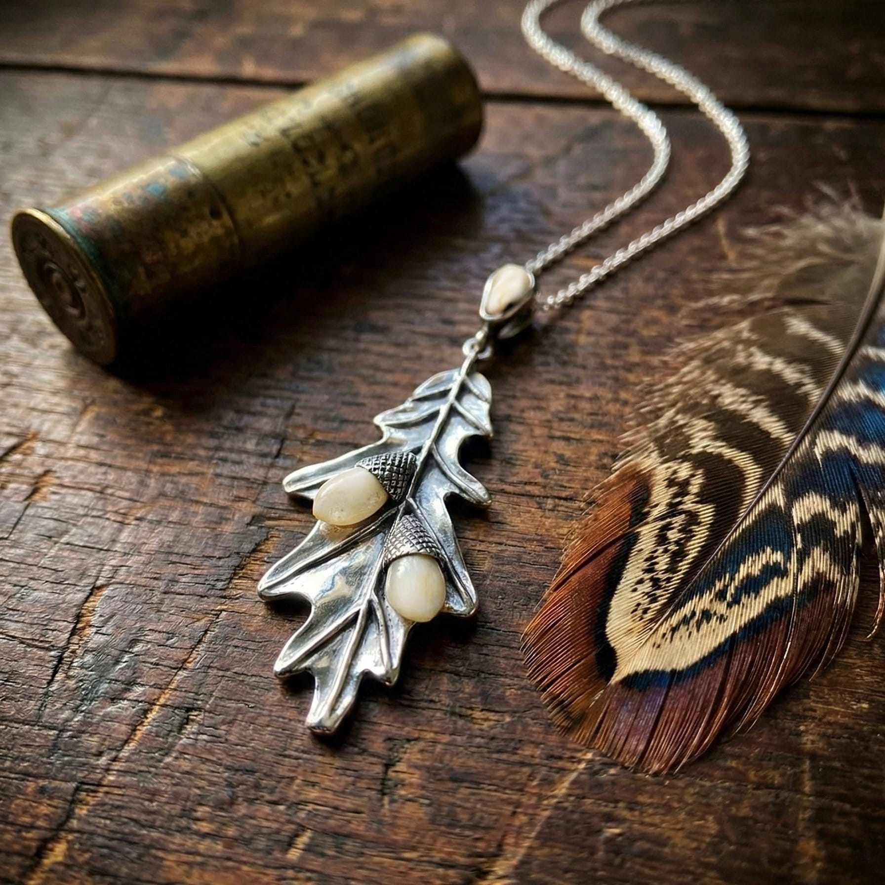Motyw dębu od wieków symbolizuje siłę, trwałość i szlachetność — wartości głęboko zakorzenione w kulturze łowieckiej. Połączenie go z grandlami sprawia, że naszyjnik staje się nie tylko ozdobą, ale także osobistym symbolem więzi z naturą i lasem.