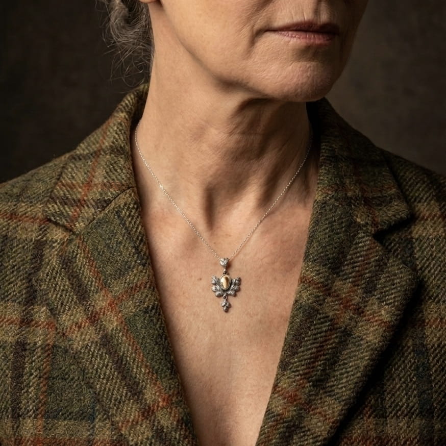 Każdy grandel łani jest unikalny – jego kształt i odcień powstały w naturze. Dzięki temu każda sztuka tej biżuterii z trofeum ma swój indywidualny charakter i stanowi wyjątkowy symbol łowieckiej tradycji.