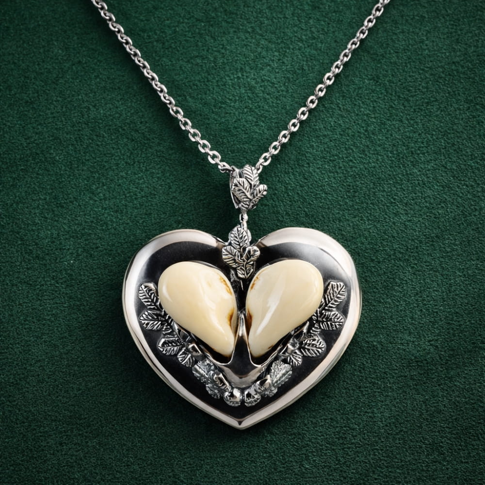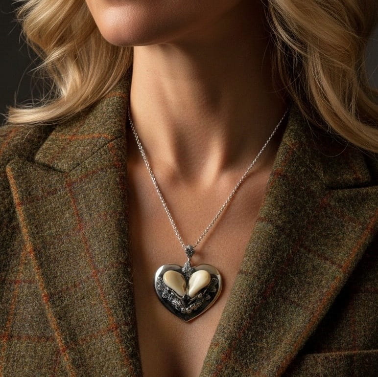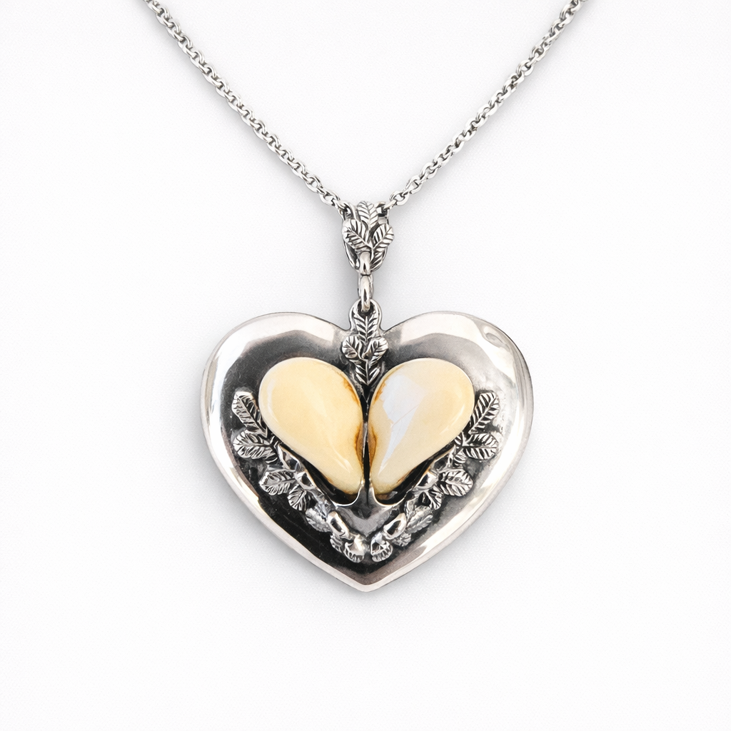 Wykonany z pary dużych grandli byka, zamkniętych w formie serca, stanowi autentyczny przykład biżuterii handmade inspirowanej naturą. Bogata oprawa z motywami świerkowych gałązek podkreśla charakter biżuterii leśnej i nawiązuje do tradycji łowieckiej. Świerk symbolizuje wytrwałość, ochronę i siłę trwania, a forma serca nadaje całości emocjonalny, osobisty wymiar.