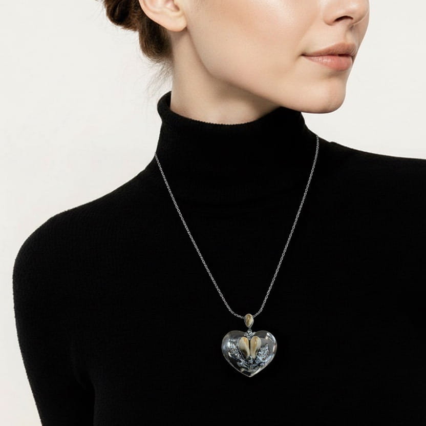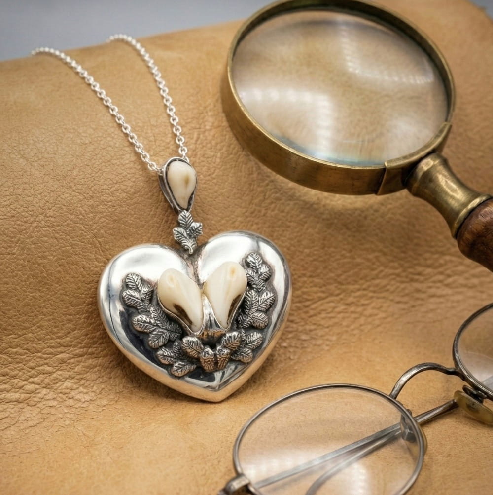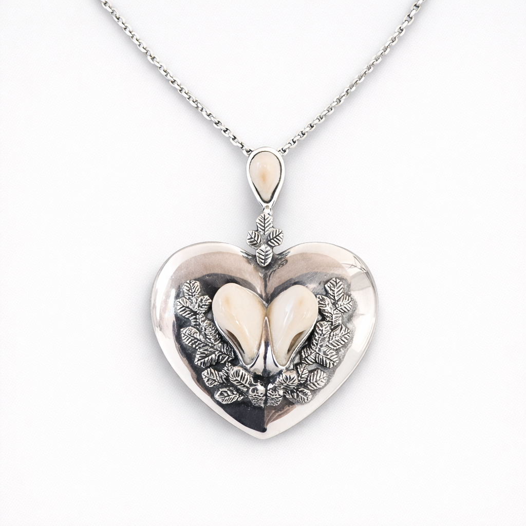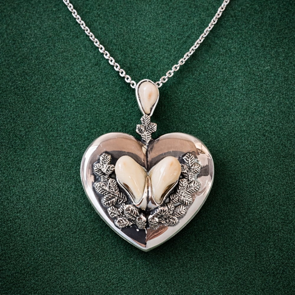 Ręcznie wykonany naszyjnik myśliwski w formie serca, stworzony z pary grandli byka oraz pojedynczego grandla łani. Symboliczna biżuteria inspirowana siłą lasu, tradycją łowiecką i więzią człowieka z naturą. Przeznaczony do noszenia na co dzień lub jako wyjątkowy, znaczący talizman.