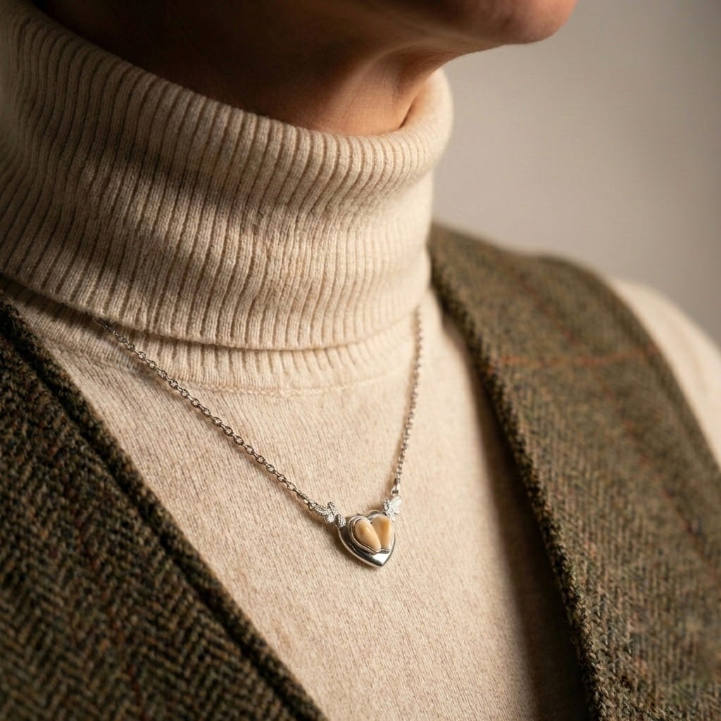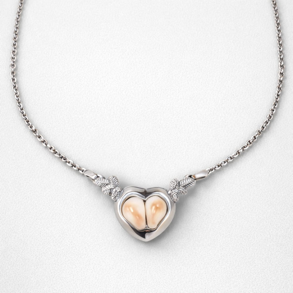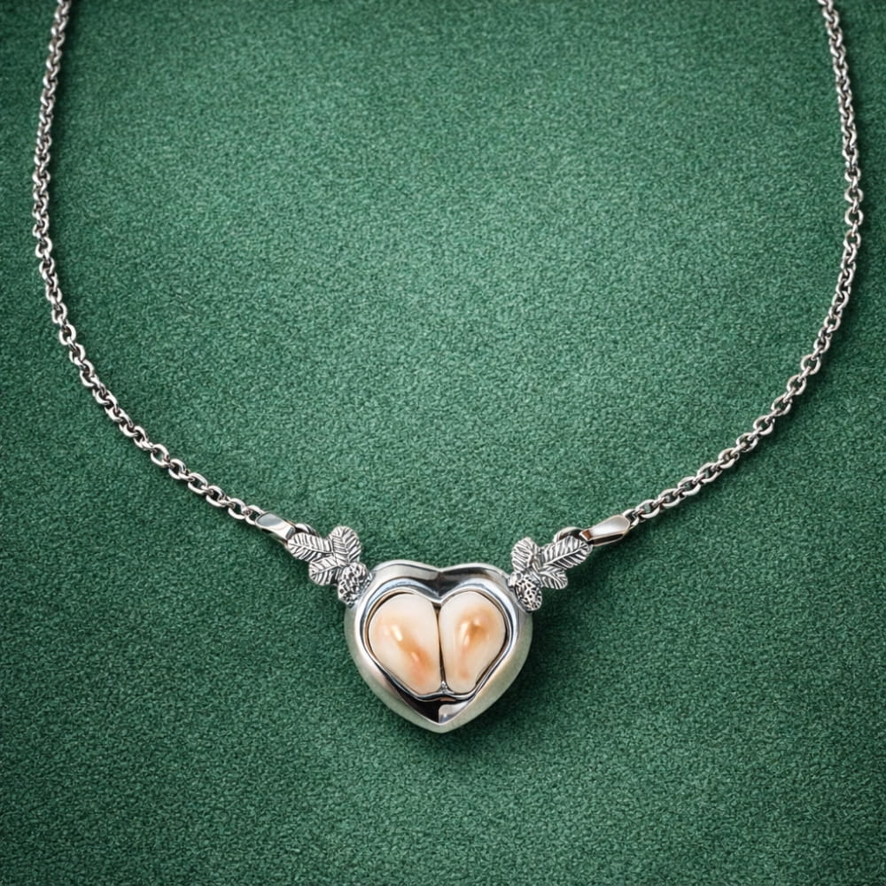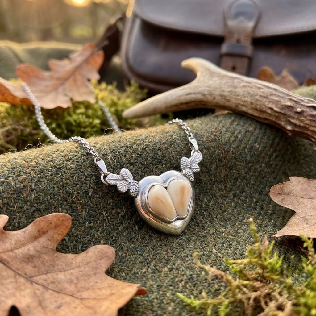 Ten naszyjnik to wyjątkowa interpretacja biżuterii myśliwskiej w subtelnej, emocjonalnej formie. Kształt serca podkreśla symbolikę bliskości natury, wrażliwości i szacunku wobec świata zwierząt. W jego centrum znajduje się para grandli łani – element rzadziej spotykany w biżuterii łowieckiej, kojarzony z delikatnością, spokojem i naturalnym pięknem.